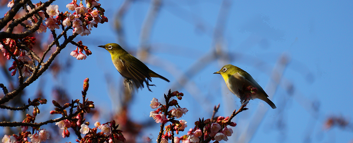 熱海桜と遊ぶメジロです。