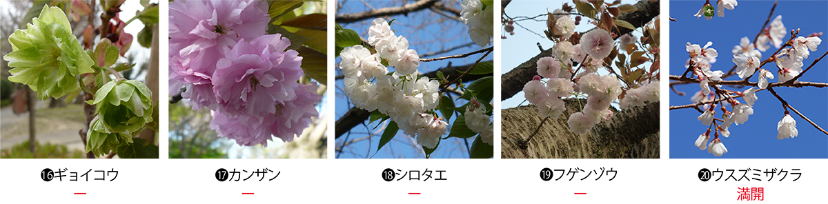 5.ヨウコウザクラ 7.ソメイヨシノ 9.オオシマザクラ 6.エドヒガンザクラ 8.シダレソメイヨシノ 10.ヤエベニオオシマザクラ 12.ヤマザクラ 13.シダレザクラ 20.ウスズミザクラ